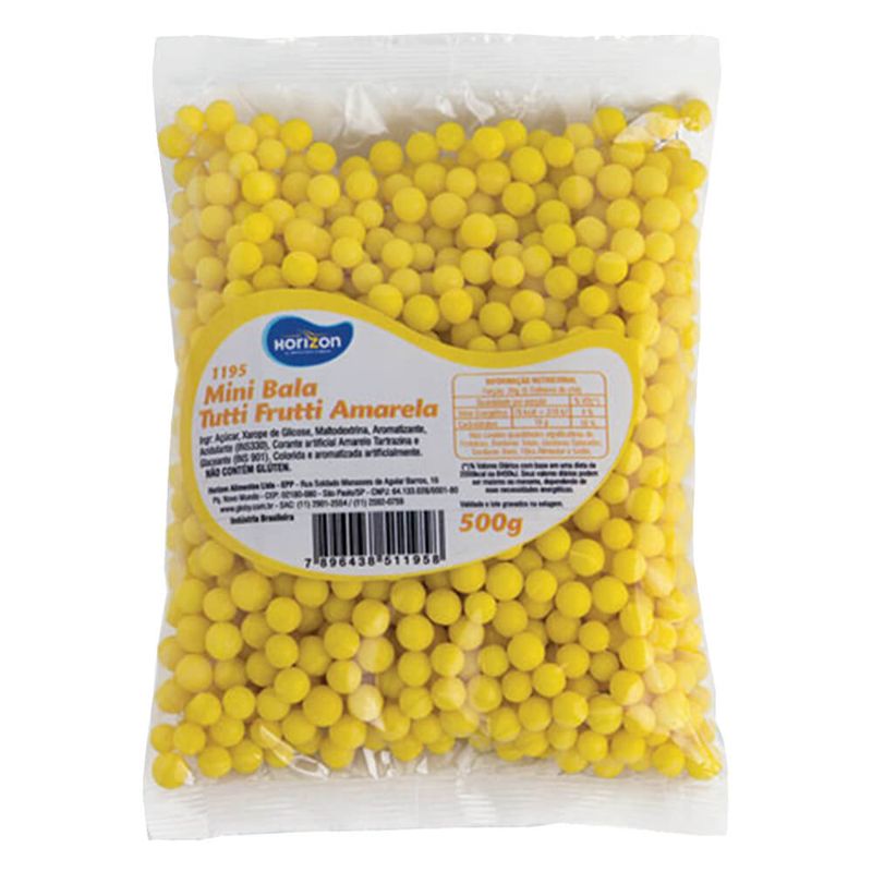 Mini balas confeitadas na cor amarela e sabor tutti frutti. Ideal para lembrancinhas e decorações de festas. Embalagem de 500g.