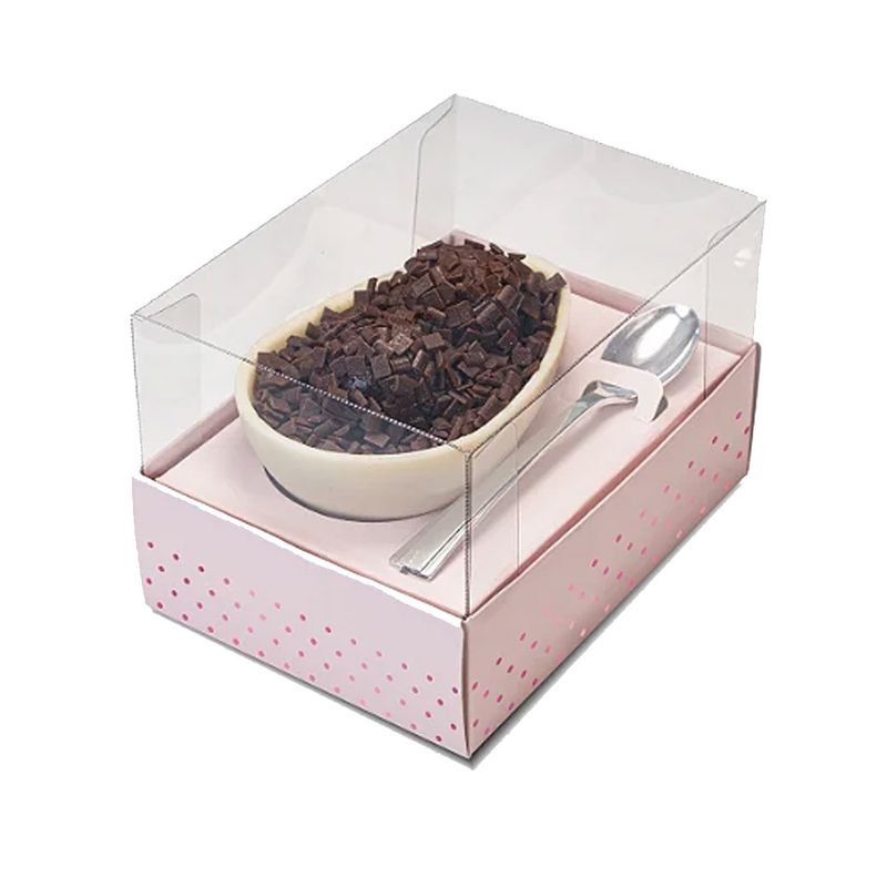 Caixa Páscoa para Ovo de Colher 2 em 1 - Rosa Poá caixa em acabamento hot stampa dourado, ela é a opção certa para quem deseja uma apresentação perfeita, agregando valor e sofisticação ao seu produto. Berços Versáteis que podem ser utilizados para tamanhos diferentes de ovos, comporta ovos de 100g ou 150g.