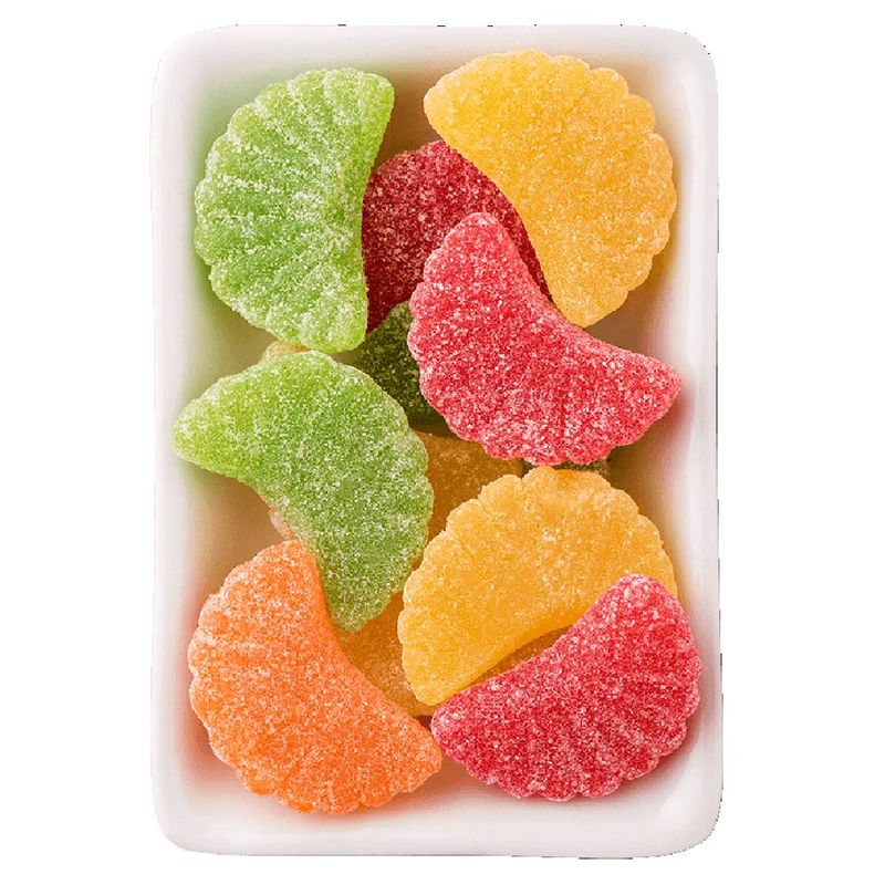 Estes gomas são uma delícia, no formato de gomos de frutas! Gomos de sabor abacaxi, morango, limão, tangerina e uva. Em média 18 unidades por pacote.
