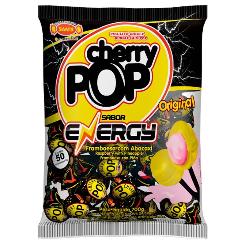 Pirulito Cherry Pop Energy sabor framboesa com abacaxi com recheio de chiclete. Contém em média 50 unidades.