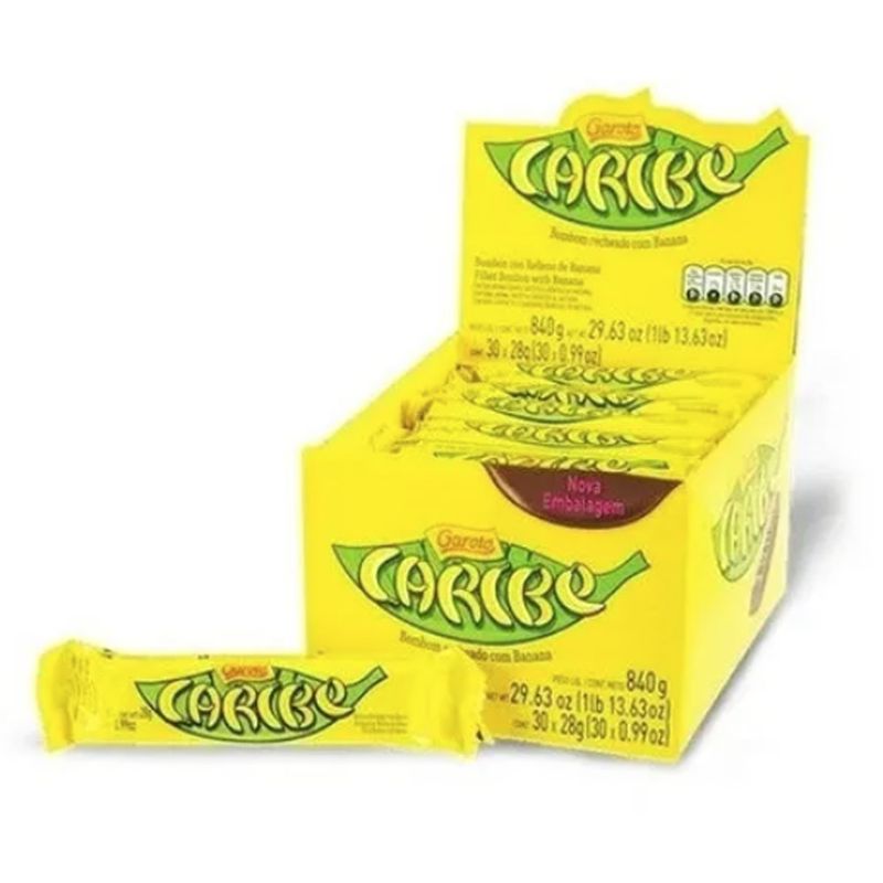Caribe, a deliciosa combinação de um tablete de banana com cobertura sabor chocolate. Contém 30 unidades de 28g cada.