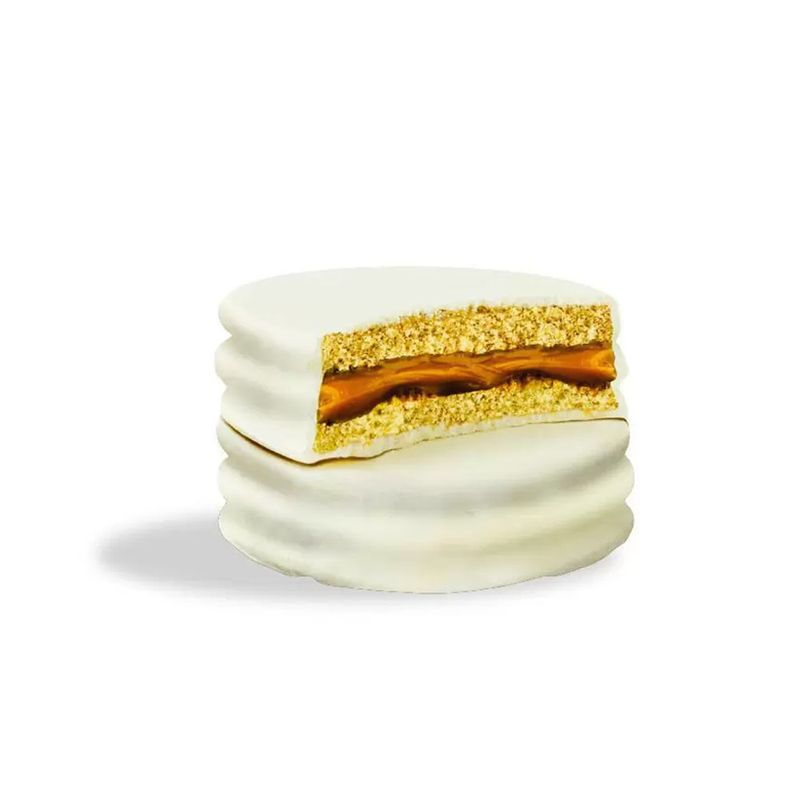 Saboroso alfajor feito com duas camadas de biscoito crocante, recheado com o doce de leite e coberto com chocolate branco.