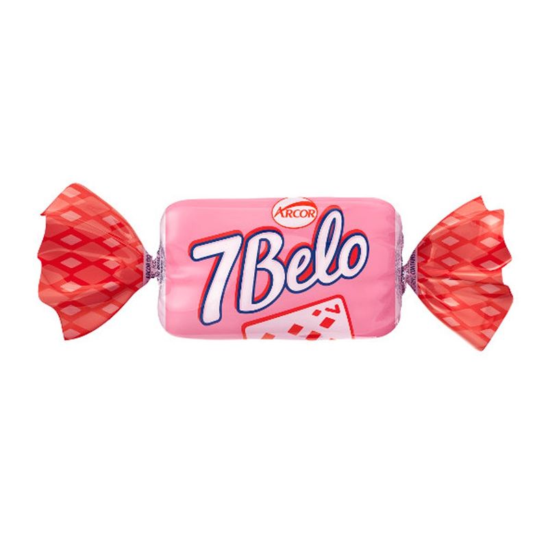A tradicional bala mastigável 7 belo no sabor iogurte de morango. Gostosa, macia e sem igual.