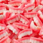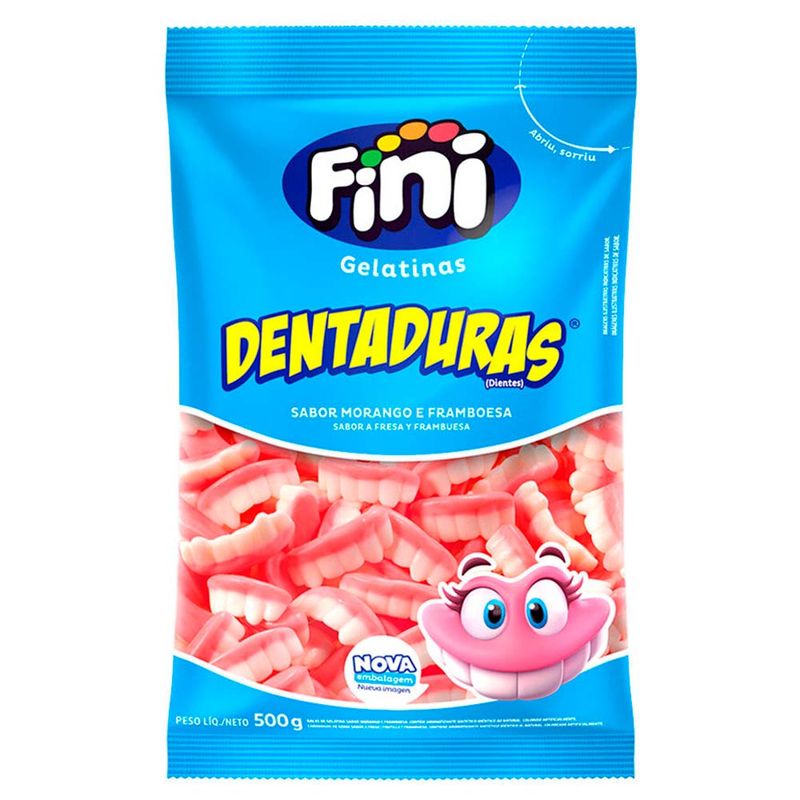 Balas de gelatina Dentaduras Fini, um clássico da marca. Docinha, macia e possuem formato de dentes. No pacote contém dentaduras nas cores rosa e branco com sabor de morango e framboesa. No pacote de 500g, é ideal para compartilhar com os amigos ou para utilizar em festas e eventos.