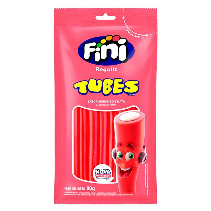 Balas de Gelatina Tubes, um clássico Fini, em formato de tubinho e sabor morango e nata.