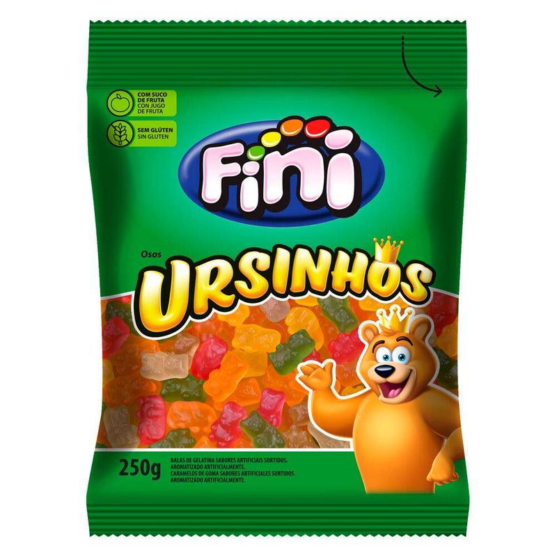 Ursinhos Fini em formato de urso, nas cores vermelho, laranja, amarelo, verde e azul, com sabor de laranja, maçã verde, morango, framboesa e maracujá.