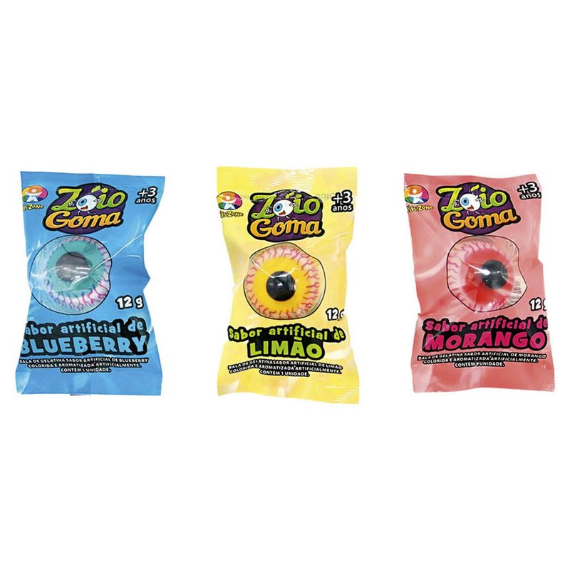 Bala de gelatina nos sabores sortidos blueberry, limão e morango! Em formato e desenho de olho, é a diversão da criançada! Unidade de 12g cada. Sabores Sortidos, sem escolha.