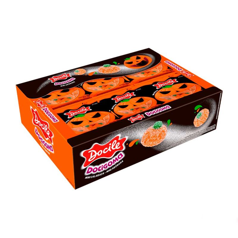 Mini bala de goma em formato de abóbora. Ideal para a sua festa de Halloween! Contém 24 unidades de 18g cada.
