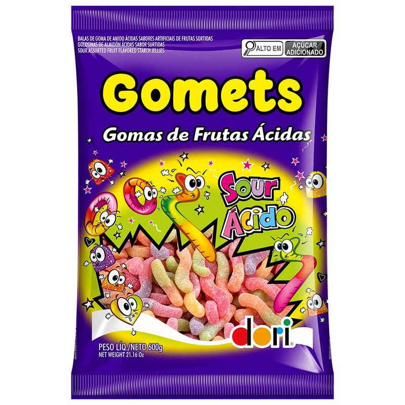 Gomets Minhocas Cítricas, balinhas de goma açucaradas ácidas em formato de minhocas e em cores sortidas, nos sabores laranja, limão, abacaxi, morango, uva e tutti frutti. Ideal para compor lembrancinhas, decorar mesas de aniversário, para o seu comércio ou carregar na bolsa para comer quando quiser. Embalagem de 150g contendo aproximadamente 30 unidades.