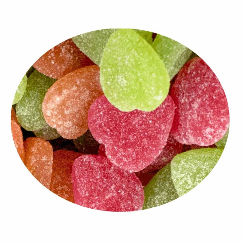 Balas de goma açucaradas em formato de coração, cores sortidas e nos sabores laranja, maçã verde e morango. Ideal para compor lembrancinhas, decorar mesas de aniversário, para o seu comércio ou carregar na bolsa para comer quando quiser.