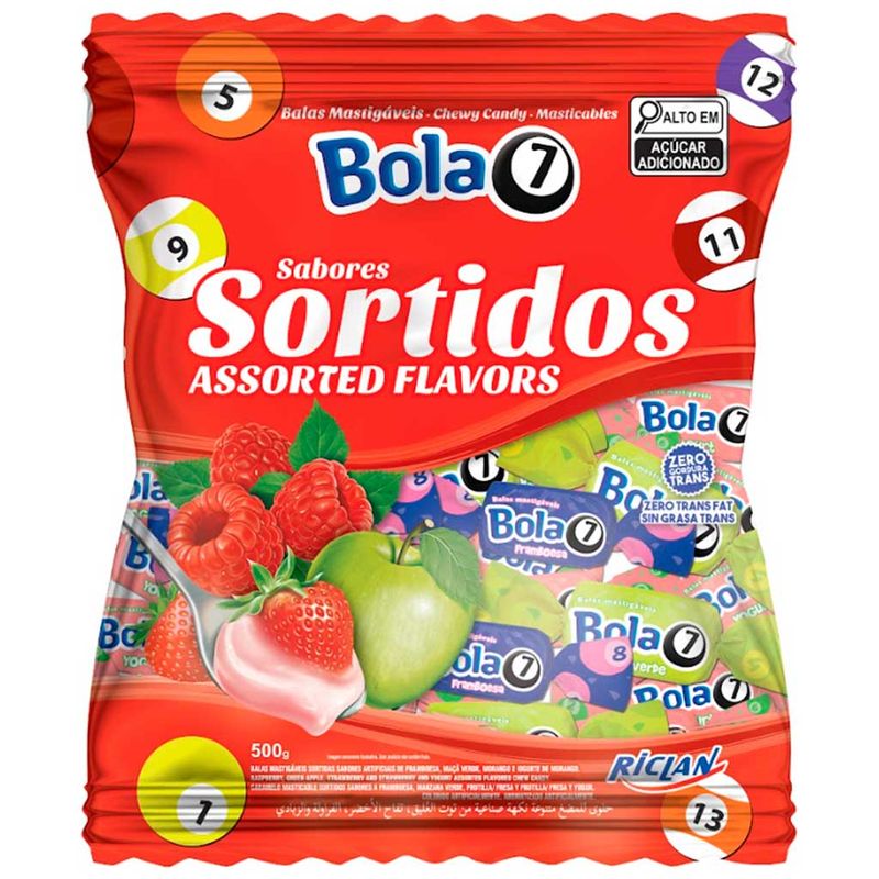 Bola 7 sortida, a bala mastigável sortida nos sabores: framboesa, maçã verde, e morango e iogurte de morango. Ideal para comemorações de festas, lembrancinhas, comércio ou para adoçar o seu dia!