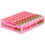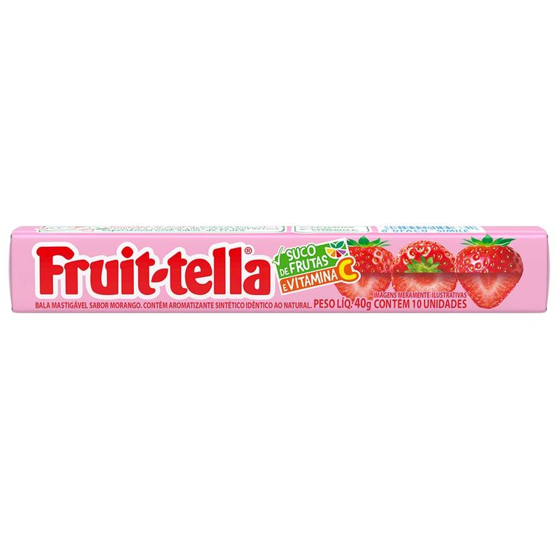Fruittella, bala mastigável sabor morango produzida com suco de fruta e vitamina C. Contém 16 sticks.