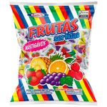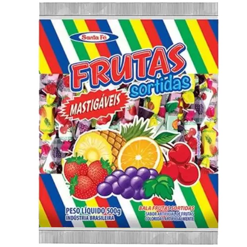 Balas mastigáveis sortidas de frutas nos sabores sortidos: uva, morango, laranja, abacaxi e cereja. Embalagem de 500g contendo aproximadamente 120 unidades.