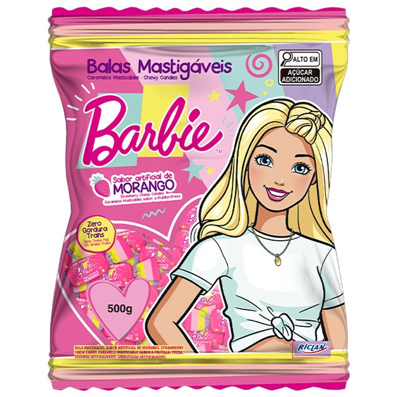 Balas mastigáveis sabor morango com tema da Barbie. Gostosas e divertidas, são ideais para compor lembrancinhas de festa, revender em seu comércio ou decoração de anivesário. Embalagem de 500g contendo aproximadamente 100 unidades.