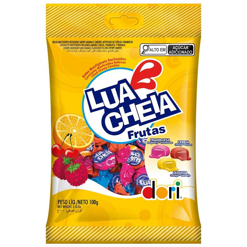 Bala Lua Cheia Frutas, são balas sortidas recheadas nos sabores cereja, framboesa e laranja. Dê um sabor mais doce ao seu dia! Embalagem de 100g contendo aproximadamete 20 unidades.