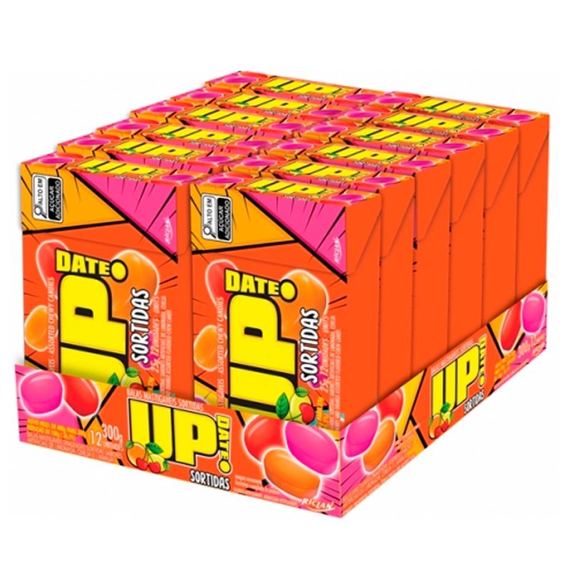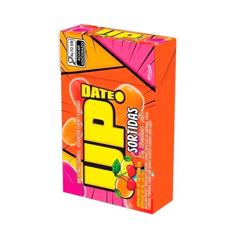 Bala mastigável drageada Up Date nos sabores de frutas: laranja, cereja e limonada.