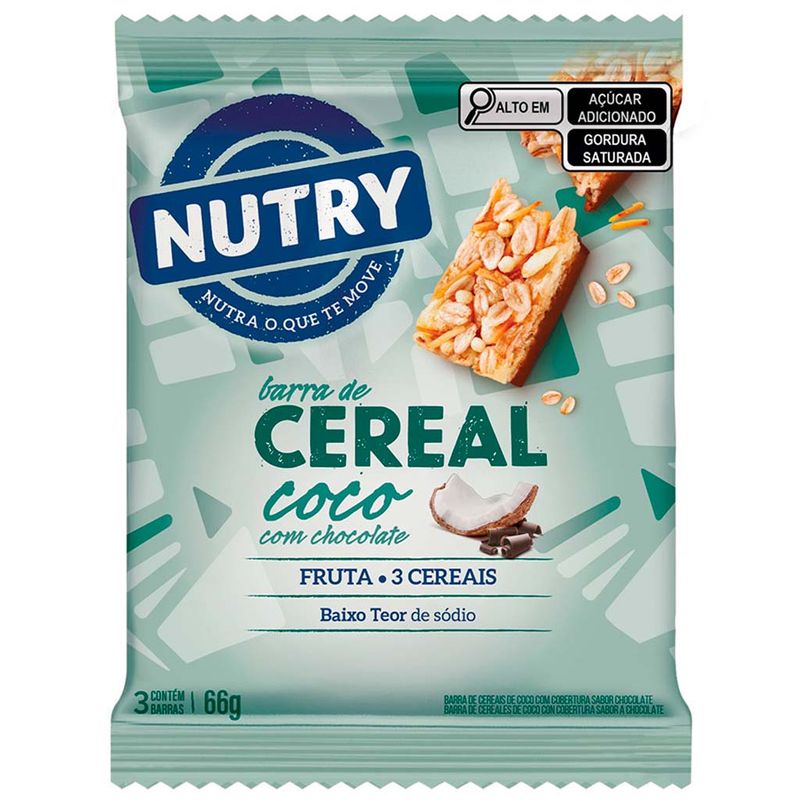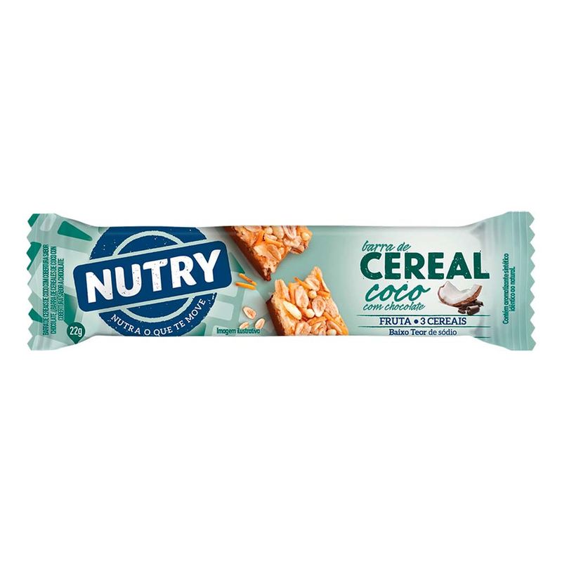 Nutry traz as barras de cereais para qualquer hora do dia, nutritivas e ricas em fibras e proteínas no delicioso sabor coco com chocolate. Ingredientes: Cereais [ Aveia e flocos de cereais ( farinhas de arroz e de milho, açúcar, maltodextrina, extrato de malte e sal)],xarope de glicose, cobertura sabor chocolate ( Açúcar, gordura vegetal, cacau em pó, soro de leite desmineralizado, leite em pó integral, leite em pó desnatado, massa de cacau, emulsificantes: lecitina de soja e éster de ácido ricinoléico com poliglicerol e aromatizante), coco queimado, açúcar invertido, gordura de palma, sal e estabilizante lecitina de soja. CONTÉM GLÚTEN.