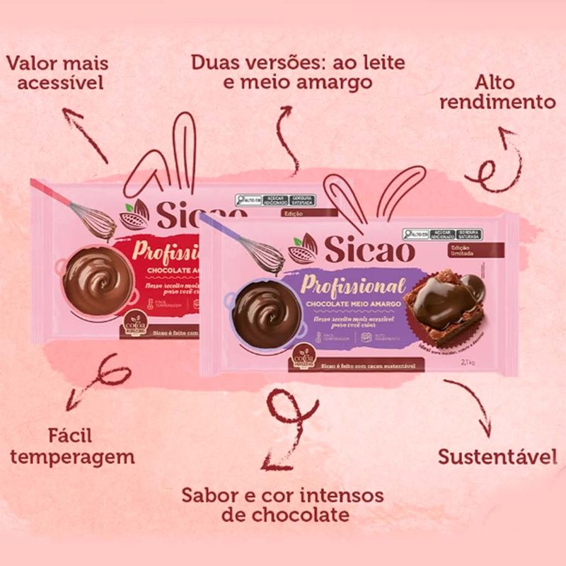 O Chocolate Meio Amargo Sicao Profissional é feito com chocolate verdadeiro e traz toda a intensidade do cacau. Tem excelente relação custo-benefício, alto rendimento e de fácil temperagem. É a escolha certa para moldar, decorar, rechear e cobrir.