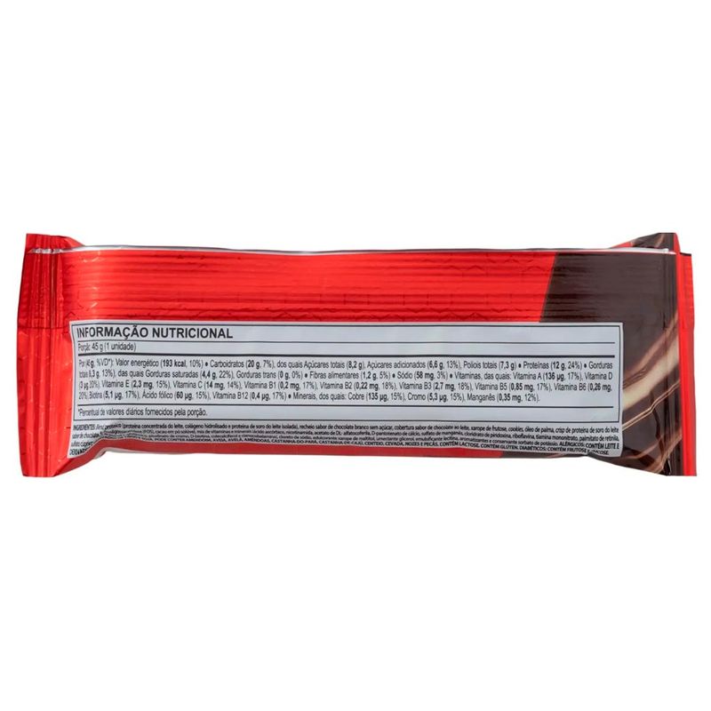 Ingredientes: Blend proteico (proteína concentrada de leite, colágeno hidrolisado e proteína do soro do leite isolada), recheio sabor de chocolate branco sem açúcar, cobertura sabor chocolate ao leite, xarope de frutose, cookies, óleo de palma, crisp de proteína de soro do leite sabor chocolate, frutooligossacarídeos (FOS), cacau em pó solúvel, mix de vitaminas e minerais (ácido ascórbico, nicotinamida, acetato de dl-alfa-tocoferol, pantotenato de cálcio, sulfato manganoso, cloridrato de piridoxina, riboflavina, tiamina mononitrato, palmitato de retinila, sulfato cúprico, ácido N-pteroil-L-glutâmico, picolinato de cromo, D-biotina, colecalciferol e cianocobalamina), cloreto de sódio, edulcorante xarope de maltitol, umectante glicerol, emulsificante lecitina, aromatizantes e conservador sorbato de potássio. Alérgicos: contém derivados de leite. Pode conter amendoim, amêndoas, avelã, centeio, castanha-de-caju, castanha-do-pará, nozes, pecãs, trigo, macadâmia, pistache e ovo. Contém lactose. Contém glúten.
