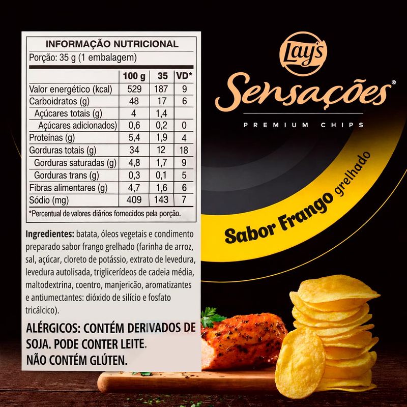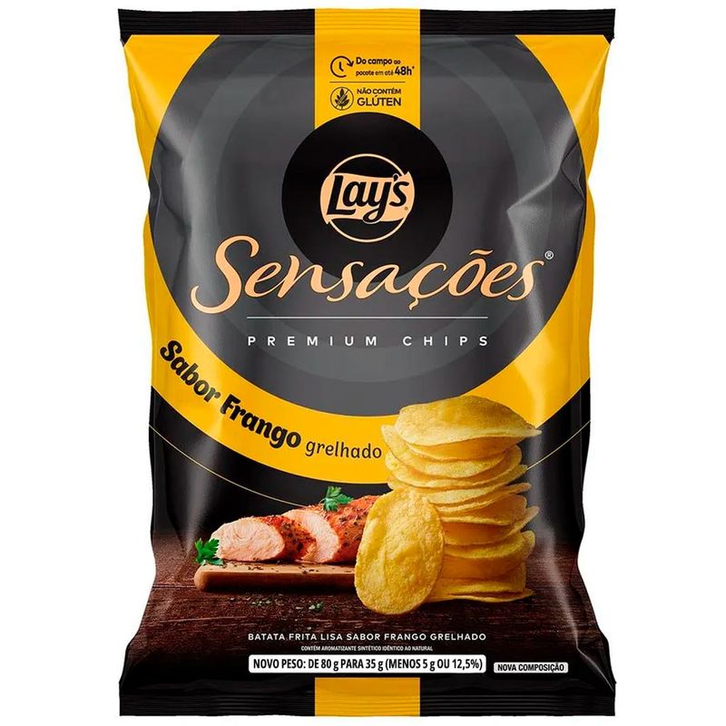 Batata Lays Sensações Frango Grelhado, uma linha de snacks temperados premium com ingredientes especiais que resultam em uma combinação de sabores e aromas autênticos. Elma Chips Sensações, desperte seus sentidos!