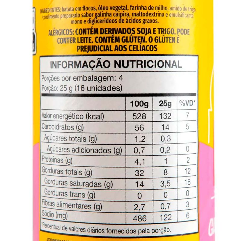 Ingredientes: batata em flocos, óleo vegetal, farinha de milho, amido de trigo, condimento preparado sabor galinha caipira, maltodextrina e emulsificante mono e diglicerídeos de ácidos graxos. Alérgicos: contém derivados de soja e trigo. Pode conter leite. Contém glúten.