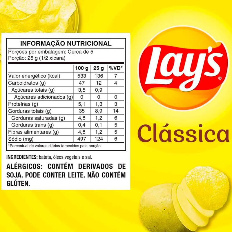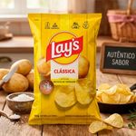 Batata Lays clássica produzida somente com batatas selecionadas, cortadas em finas fatias lisas e preparadas apenas com óleo vegetal e sal. Cuidadosamente embaladas para que se mantenham sempre fresquinhas e crocantes.