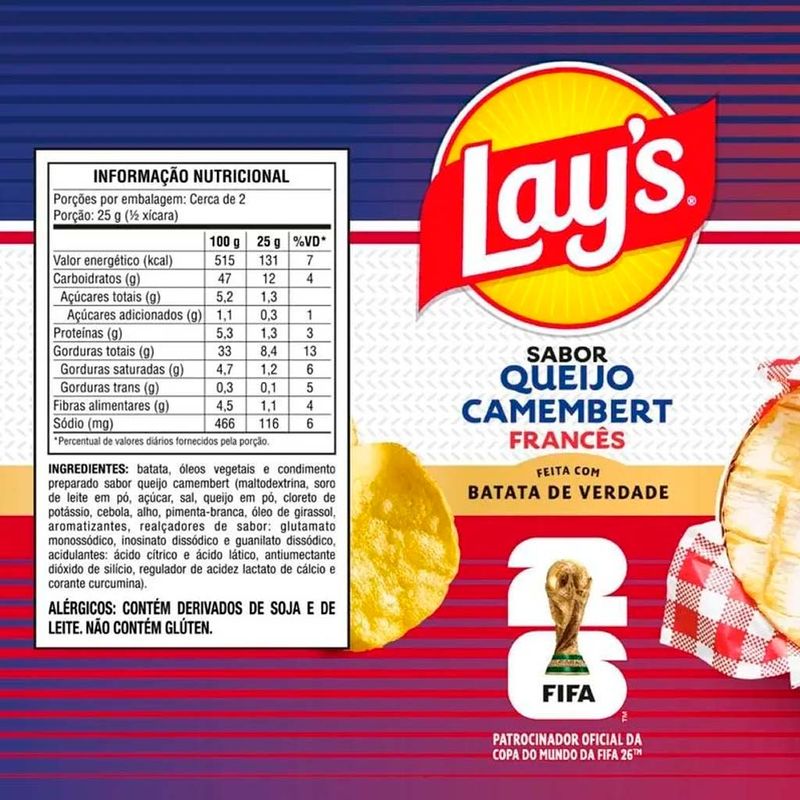 A linha de edição limitada da Lay’s foi inspirada na Copa do Mundo Fifa, trazendo sabores típicos de diferentes países para uma experiência única e cheia de personalidade. O sabor Queijo Camembert Francês homenageia a tradição gastronômica da França, combinando sofisticação e muito sabor em cada batata.