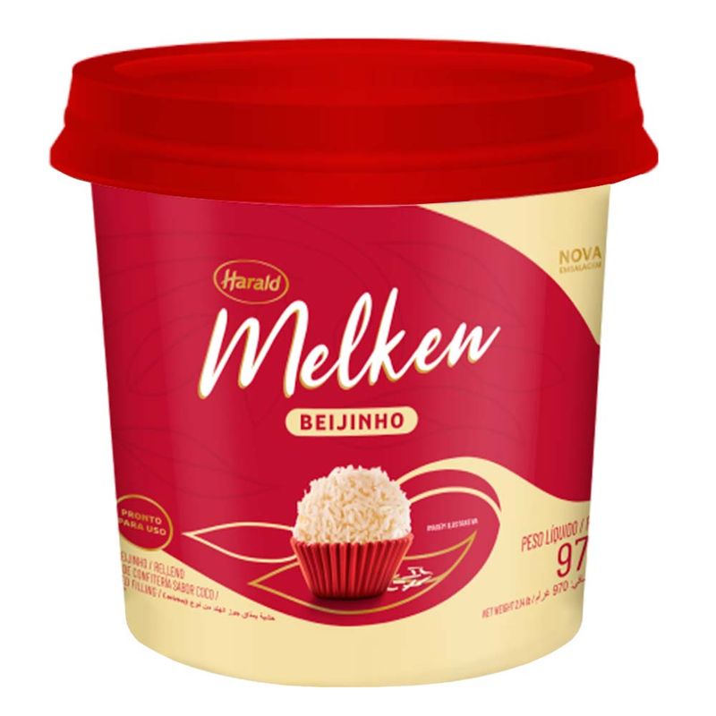 Beijinho sabor Coco Melken 970g, O açúcar e o coco marcam o sabor desse doce tradicional brasileiro! Rende 100 beijinhos de 10g, sendo ideal para uso profissional.