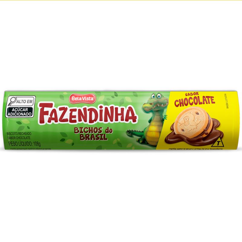Biscoito Fazendinha Bichos do Brasil recheado sabor chocolate. Crocante e gostoso, vem com os animais desenhados para a criançada se divertir.