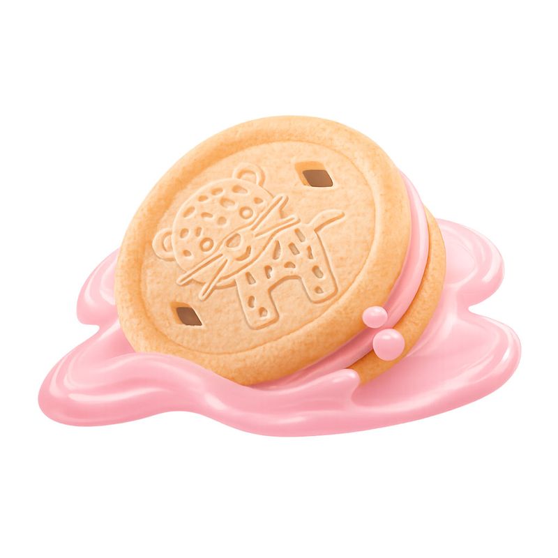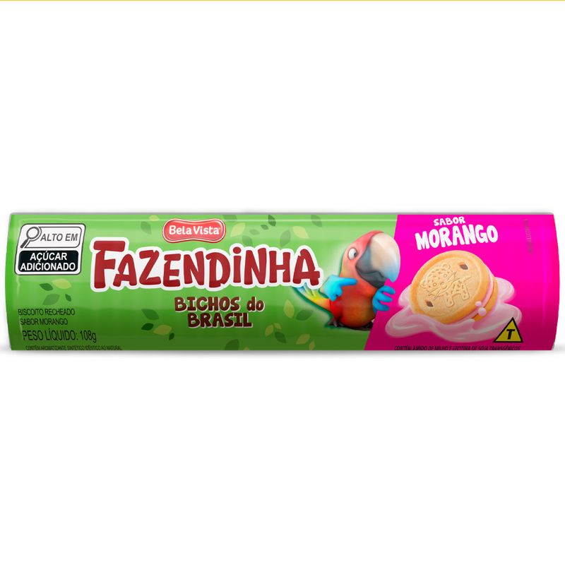 Biscoito Fazendinha Bichos do Brasil recheado sabor morango. Crocante e gostoso, vem com os animais desenhados para a criançada se divertir.