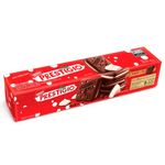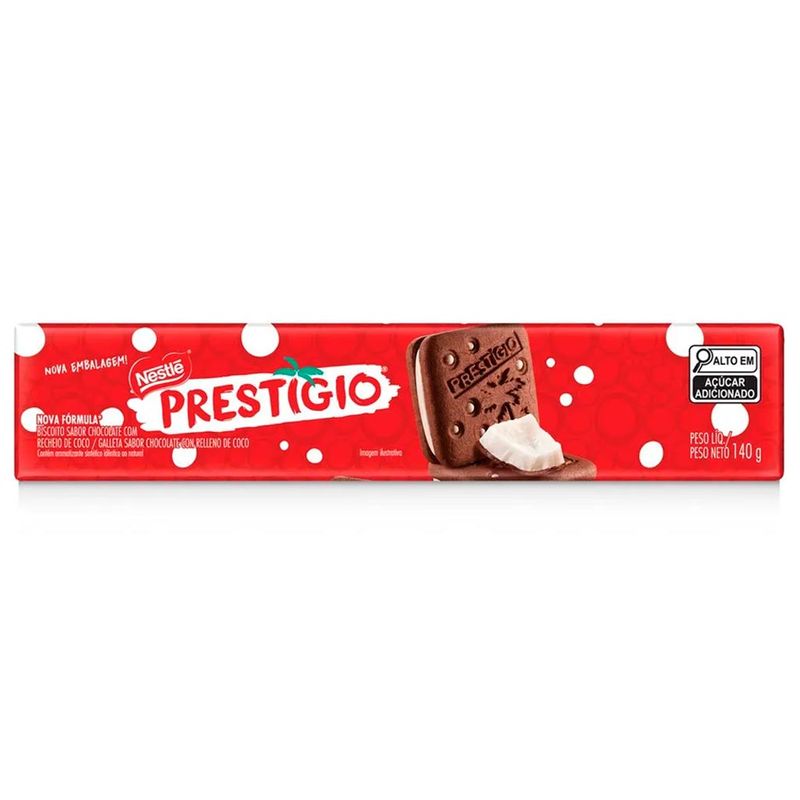 Biscoito recheado prestígio. Biscoito crocante sabor chocolate e recheio sabor coco.
