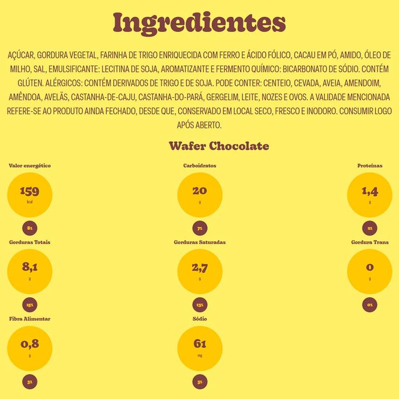 Ingredientes: açúcar, gordura, vegetal, farinha de trigo enriquecida com ferro e ácido fólico, cacau em pó, amido, óleo de milho, sal , emulsificante: lecitina de soja, aromatizante e fermento químico: bicarbonato de sódio. contém glúten. Alérgicos: contém derivados de trigo e de soja. pode conter: centeio, cevada, aveia, amendoim, amêndoa, avelãs, castanha-de-caju, castanha-do-pará, gergelim, leite, nozes e ovos.