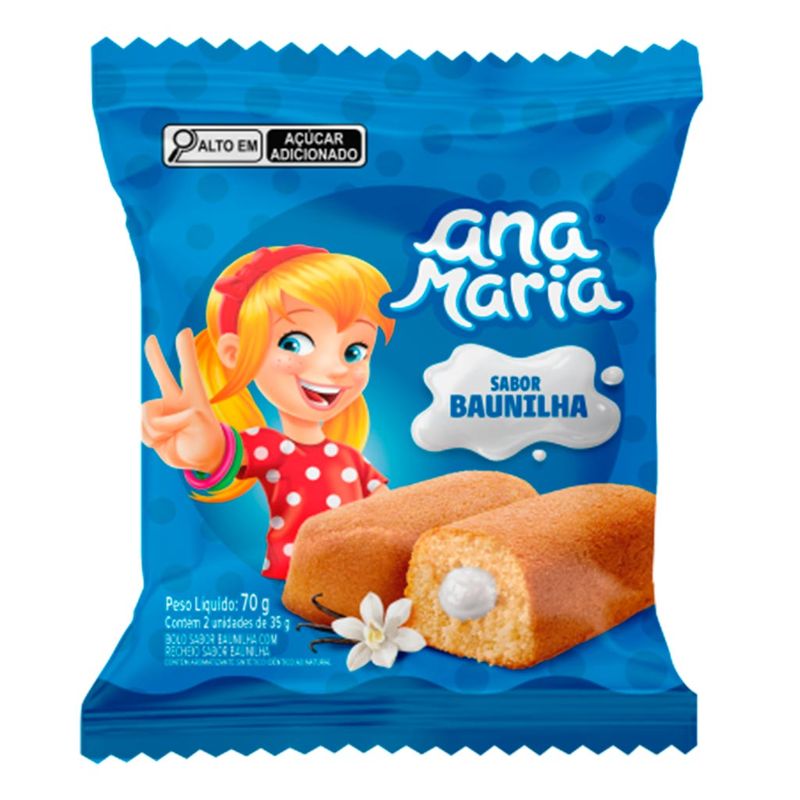 Bolinho sabor baunilha com recheio sabor baunilha. Ana Maria é uma ótima opção de lanchinho, gostoso, prático e divertido. Contém 2 unidades de 35g cada.
