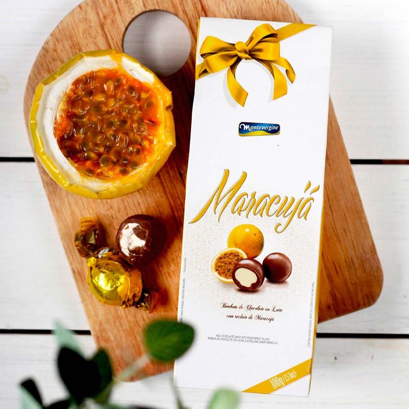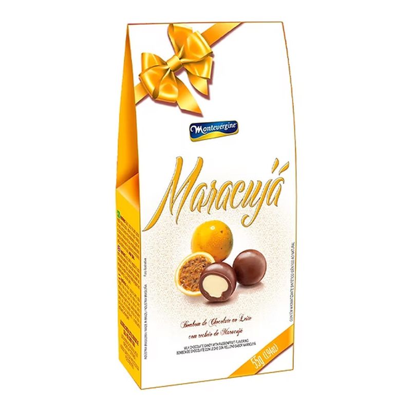 Delicioso bombom de chocolate ao leite com recheio sabor maracujá. Ideal para se deliciar ou presentear alguém. Embalagem de 55g contendo em média 4 unidades.