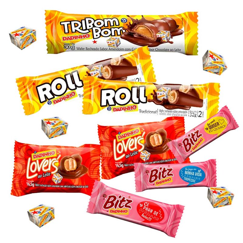 Família Dadinho Exclusividades, uma caixa com delícias Dadinho para compartilhar. Contém os doces: Dadinho Lovers; Dadinho Tribombom; Dadinho Roll; Dadinho Bitz; Dadinho Duo e Dadinho Tradicional. São em média 18 unidades sortidas.