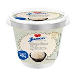 Ingredientes: Soro de leite refrigerado e/ou soro de leite em pó reconstituído, açúcar, leite fluído á granel de uso industrial e/ou leite em pó integral reconstituído, amido modificado, água, concentrado proteico de soro de leite em pó, espessante pectina (INS 440), aroma idêntico ao natural de chocolate branco, conservante sorbato de potássio (INS 202), aroma idêntico ao natural de leite, estabilizante citrato de sódio (INS 331ii) e corante dióxido de titânio (INS 171).