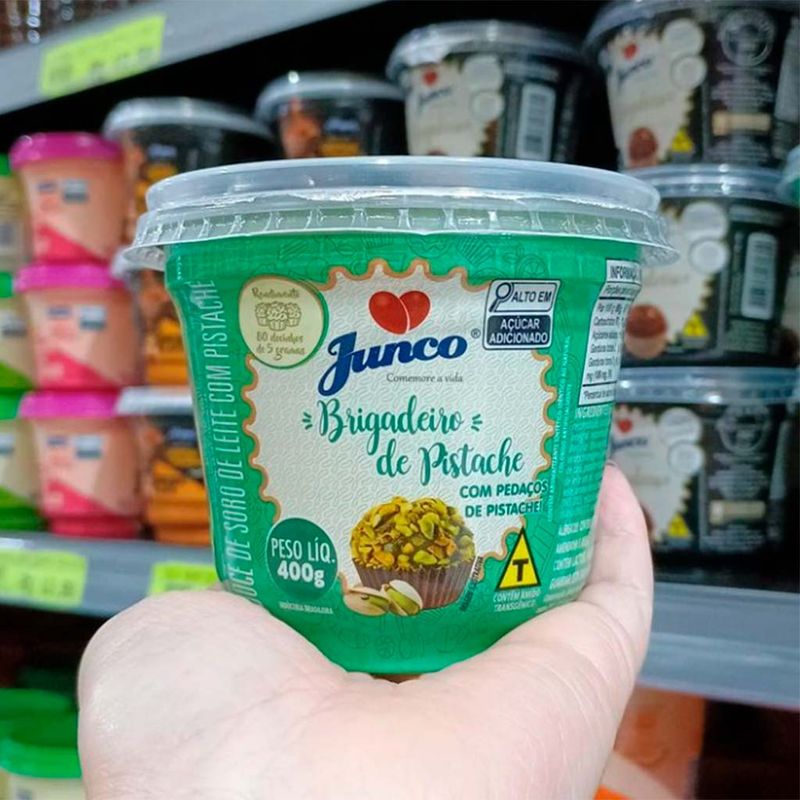 Ingredientes: Soro de leite refrigerado e/ou soro de leite em pó reconstituído, açúcar, leite fluído à granel de uso industrial e/ou leite em pó integral reconstituído, amido modificado, água, farinha de castanha de caju, pistache triturado, pasta de pistache, concentrado proteico de soro de leite em pó, espessante pectina (INS 440), aroma idêntico ao natural de leite, aroma idêntico ao natural de pistache, conservante sorbato de potássio (INS 202), estabilizante citrato de sódio (INS 331iii), corantes dióxido de titânio (INS 171), amarelo tartrazina (INS 102) e indigotina (INS 132). Não contém glúten. Contém lactose. Alérgicos: Contém leite e derivados, castanha de caju e pistache. Pode conter amendoim e avelã.