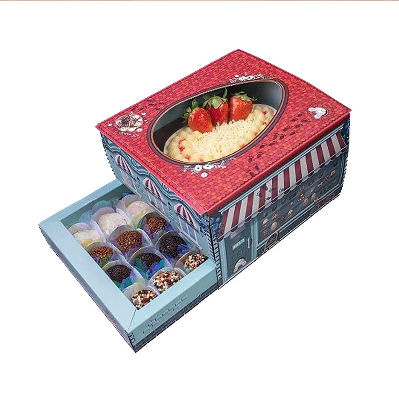Composto por duas partes, a caixa comporta uma casca de ovo de colher de 350g na parte superior + gaveta para 16 docinhos na parte inferior.