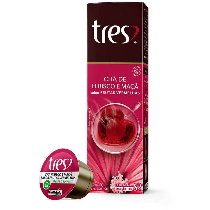 O novo chá da TRES® de HIBISCO E MAÇÃ SABOR FRUTAS VERMELHAS possui a delicadeza da maçã, o frescor do hibisco e o toque adocicado das frutas vermelhas. Uma combinação surpreendente de sabores. Cada cápsula faz 100ml, na máquina utilize o botão verde, apertando uma vez. Caixa contendo 10 cápsulas de 2,5g. Experimente também esta bebida gelada.