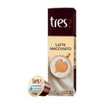 Latte Macchiato Três Corações, é uma mistura para o preparo Latte Macchiato é uma bebida levemente adocicada, muito cremosa e suave, feita com leite e um toque de café. Se você gosta do café com leite TRES vai adorar esse lançamento! Embalagem contendo 10 cápsulas. Faz 80ml de café, aperte uma vez o botão azul.