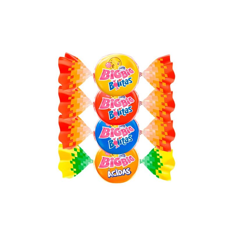 Chiclete Big Big Bolitas, uma explosão de sabores. Tem formato de bolinha, com casquinha crocante e nos sortido nos sabores: laranja, pêssego, cereja e tutti frutti.