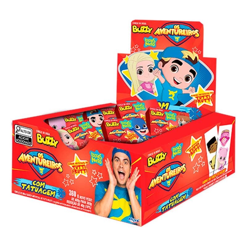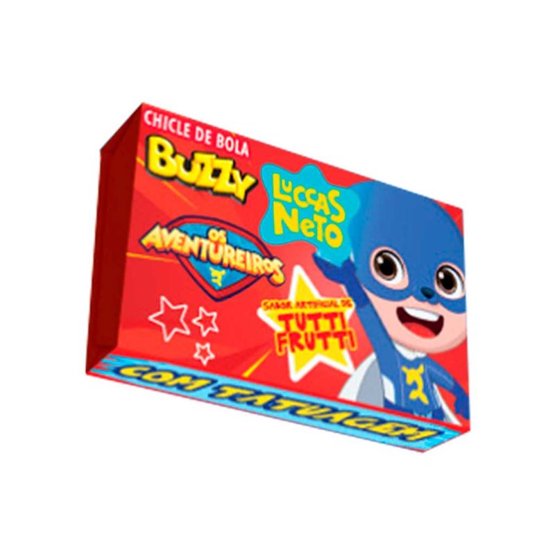 Chiclete Buzzy Luccas Neto sabor tutti frutti. Gostoso e divertido, contém tatuagens para você colecionar. Embalagem contendo em média 90 unidades.