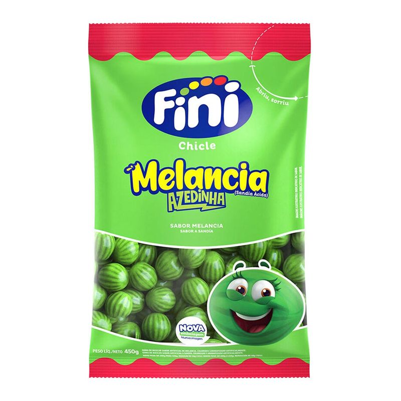 Chicles com formato e acabamento de uma melancia, com recheio cítrico e miçangas açucaradas na cor preta, fazendo alusão as sementes de uma melancia real. Na cor verde com mesclas mais claras, no sabor de melancia. Pacote de 450g ideal dividir com os amigos ou para uso grande quantidade. Média de 90 unidades no pacote de 450g.