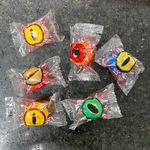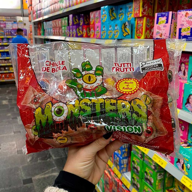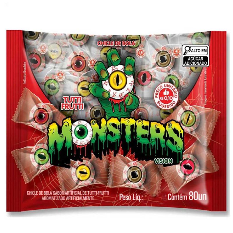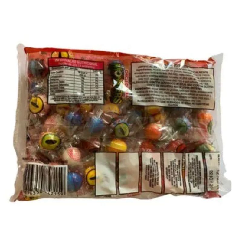 Chiclete de bola mastigável sabor Tutti Frutti. Embalagem de 520g com 80 unidades embaladas individualmente. Obs.: O chiclete não tem o desenho de olho, somente a embalagem.