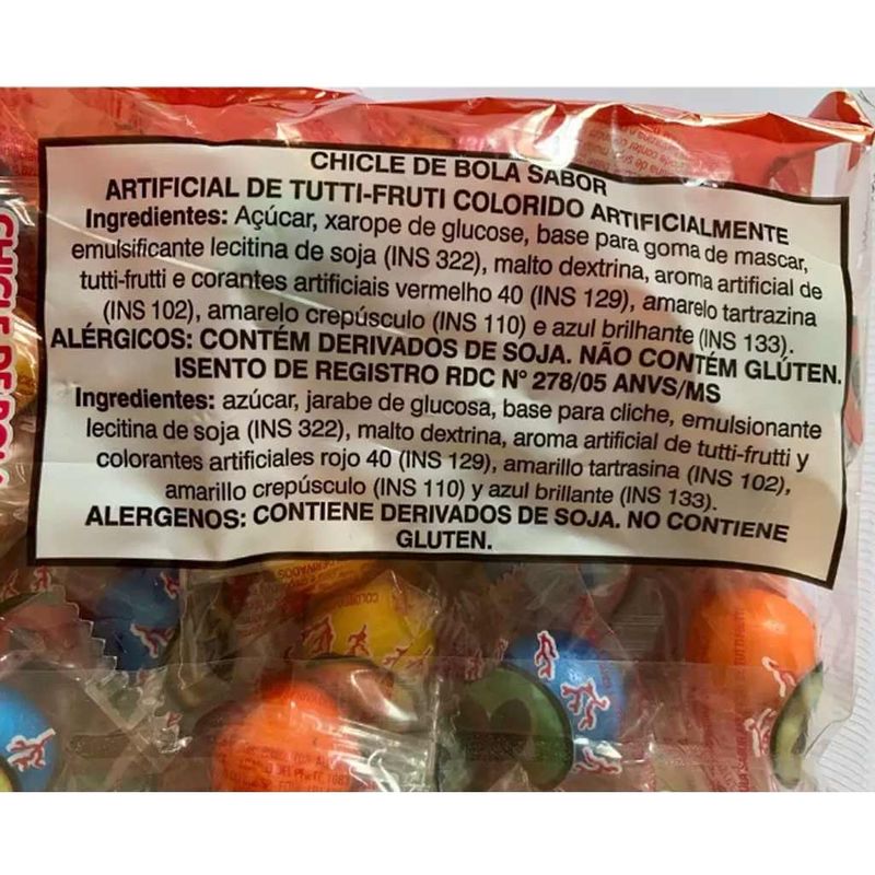 Ingredientes: açúcar, xarope de glucose, base para goma de mascar e emulsificante lecitina de soja, malto dextrina, aroma artificial de tutti frutti. Pode conter corantes artificiais vermelho 40 (allura), amarelo tartrazina, amarelo crepúsculo e azul brilhante. Alérgicos: contém derivados de soja. Não contém glúten.