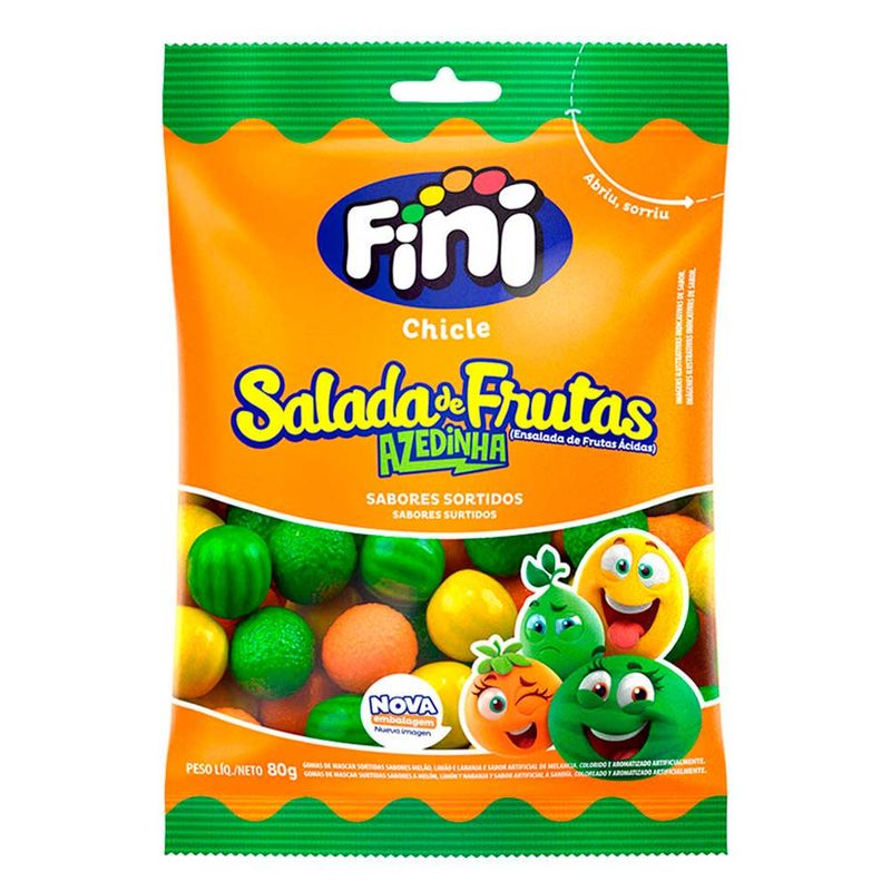 No pacote contém chicle salada de frutas nas cores verde, amarelo e laranja com sabor de melancia, limão, laranja e melão, com recheio cítrico.