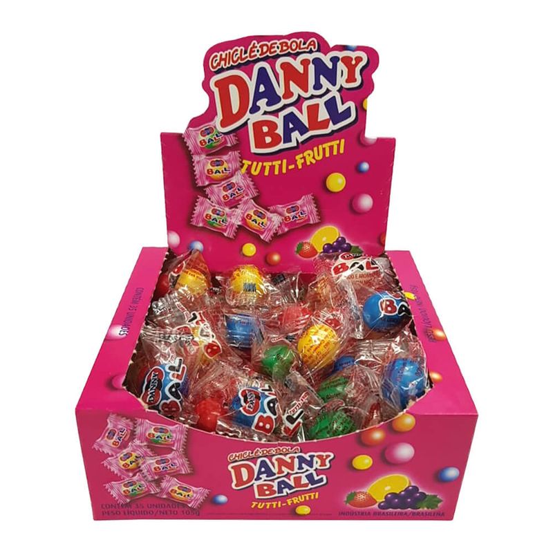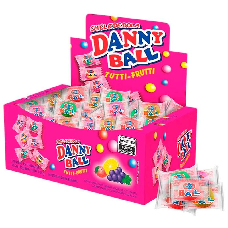 Chiclete de bola mastigável sabor tutti frutti. Caixa de 105g contendo 35 unidades.