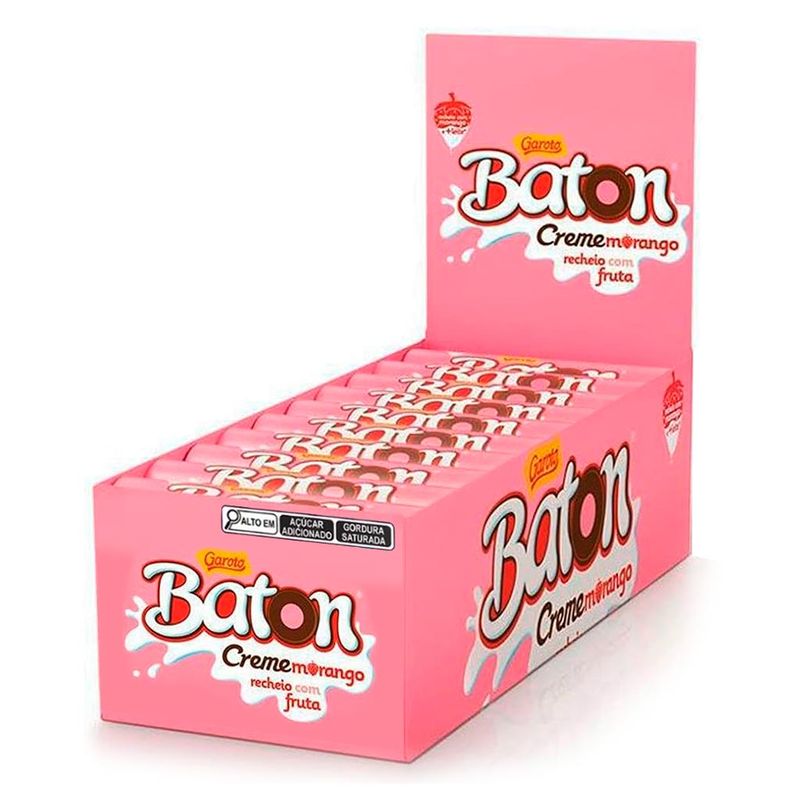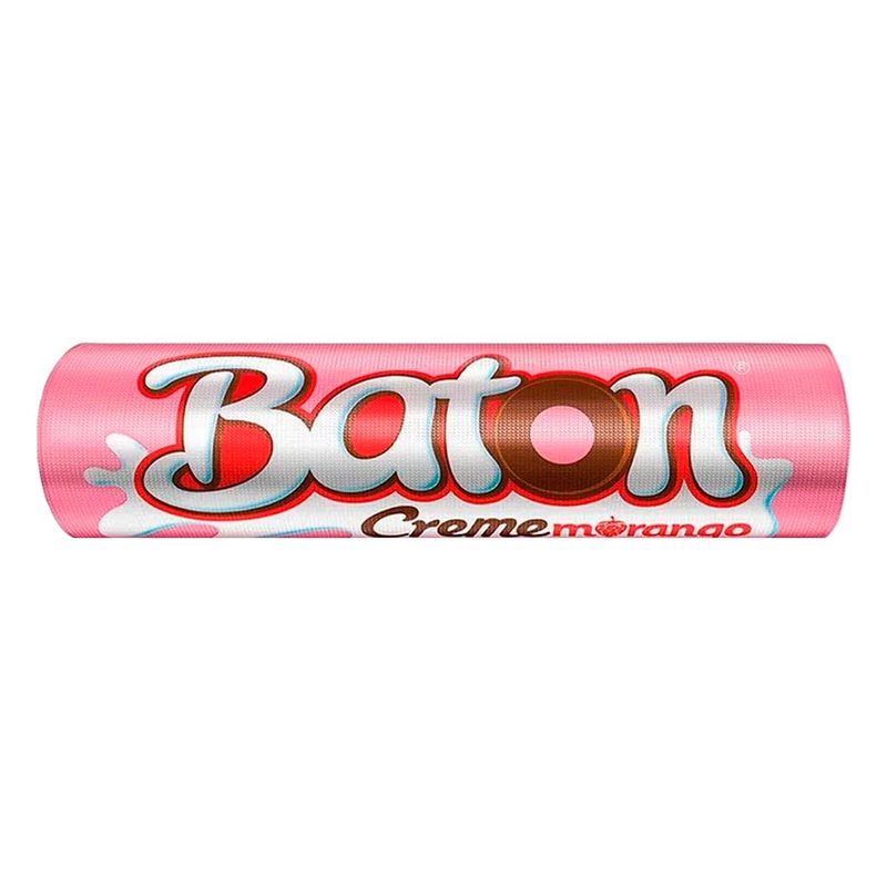 Baton, o chocolate infantil mais querido do Brasil em sua versão creme morango. Chocolate ao leite com recheio ao leite e morango.