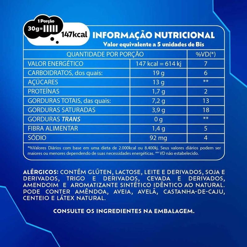 Ingredientes: Açucar, farinha de trigo enriquecida com ferro, ácido fólico, vitaminas B1, B2, B3 e zinco, cacau, gordura vegetal, gordura vegetal hidrogenada, farinha de soja, soro de leite em pó, gordura de manteiga desidratada, sal, óleo vegetal, emulsificantes: lecitina de soja e poliglicerol, polirricianoleato, fermento químico bicarbonato de sódio, e aromatizante. ALÉRGICOS: CONTÉM DERIVADOS DE TRIGO, LEITE E SOJA. PODE CONTER AMÊNDOA, CEVADA, CASTANHA-DE-CAJU, AVELÃ, AVEIA, AMENDOIM, CENTEIO E LÁTEX NATURAL. CONTÉM LACTOSE. CONTÉM GLÚTEN.