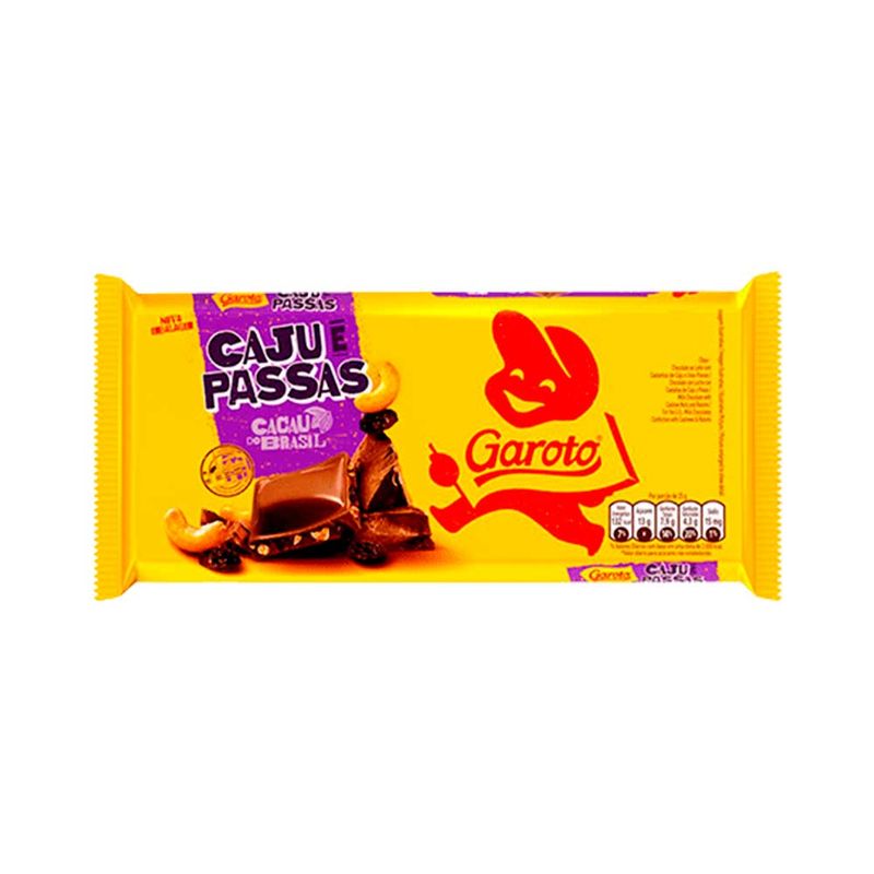 Ingredientes: açúcar, leite em pó, massa de cacau, manteiga de cacau, castanha de caju, uva passa, gordura vegetal, cacau em pó, gordura anidra de leite, emulsificantes lecitina de soja e poliglicerol polirricinoleato e aromatizante. ALÉRGICOS: CONTÉM CASTANHA-DE-CAJU E DERIVADOS DE LEITE E DE SOJA. PODE CONTER AMENDOIM, AMÊNDOA, CASTANHA-DO-PARA, AVELÃ, AVEIA, CENTEIO, CEVADA E TRIGO. CONTÉM GLUTÉN E LACTOSE.